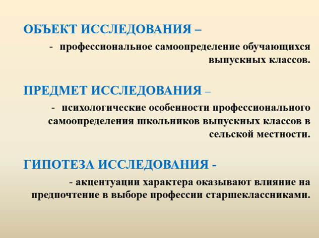 Объектом исследования в работе выступает профессиональное самоопределение обучающихся выпускных классов. В качестве предмета исследования выделены психологические особенности профессионального самоопределения школьников выпускных классов в сельской местности. Выдвинутая гипотеза исследования звучит следующим образом: Акцентуации характера оказывают влияние на предпочтение в выборе профессии старшеклассниками.