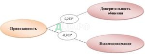 Полученные в ходе тестирования испытуемых по выбранным методикам данные и их последующая обработка выявили ряд интересных закономерностей. Данные корреляционного анализа показали две связи между личностными особенностями и особенностями общения супругов: положительная связь привязанности с доверительностью общения и отрицательная – с взаимопониманием в общении. На рисунке 1 представлена корреляционная плеяда, отражающая выявленные связи.