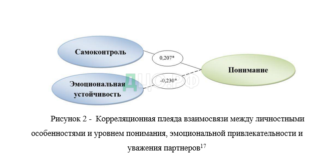 близкими людьми, способны сопереживать и нести ответственность за общее дело, добросовестно выполняя свои обязанности. Как правило, им удается выстраивать доверительное общение с партнером, делясь с ним сокровенным, не боясь непринятия. В то же время, чем больше один из супругов привязан, тем чаще он не принимает и осуждает взгляды и поведение другого, если они не совпадают с его собственными. Также в ходе корреляционного анализа выявлено две связи между личностными особенностями и уровнем понимания, эмоциональной привлекательности и уважения партнеров: положительная связь между самоконтролем и пониманием и отрицательная между эмоциональной устойчивостью и пониманием.