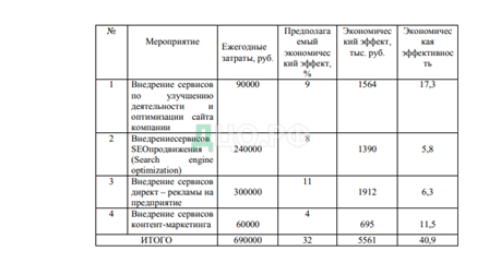 Эф = Прож/З Где: Эф – экономическая эффективность предложенных мероприятий; З –затраты, связанные с внедрением инструмента интернет-маркетинга; Прож – ожидаемая прибыль от рекомендации.
