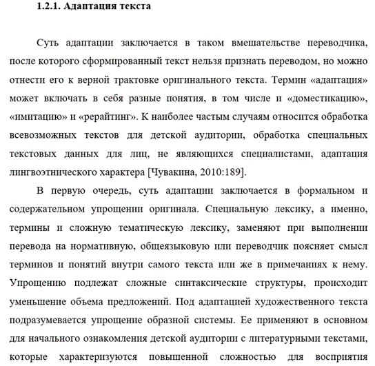 При применении адаптации текстовую информацию приспосабливают к уровню восприятия. Происходит переделка иностранного теста для улучшения его понимания детской аудиторией, преобразование специальных текстов в форму, которая будет доступна для понимания аудитории без специальной подготовки и лингвоэтническая адаптация [Сапогова, 2013:301].