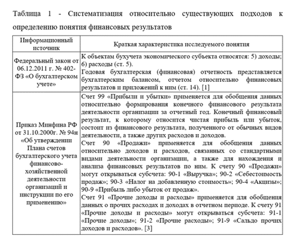 Профессор Л.Т. Гиляровская отстаивает мнение, что под финансовым результатом подразумевается обобщающий параметр, касающийся анализа и оценки эффективности либо неэффективности в деятельности субъекта хозяйствования при определенных стадиях его формирования [6]. В плане счетов, согласно с утвержденным приказом Минфина Российской Федерации «Об утверждении Плана счетов бухгалтерского учета финансово-хозяйственной деятельности организаций и инструкции по его применению» от 31.10.2000г. №94н (ред. от 08.11.2010) за счетом 99 «Прибыли и убытки» закрепляются для обобщения данные относительно формирования конечного финансового результата деятельности организации за отчетный год [3].