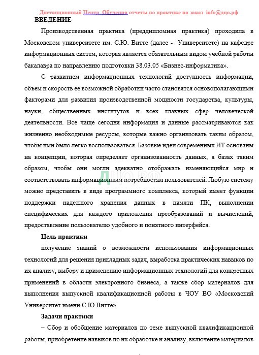 Производственная практика (преддипломная практика) проходила в Московском университете им. С.Ю. Витте (далее — Университете) на кафедре информационных систем, которая является обязательным видом учебной работы бакалавра по направлению подготовки 38.03.05 «Бизнес-информатика».