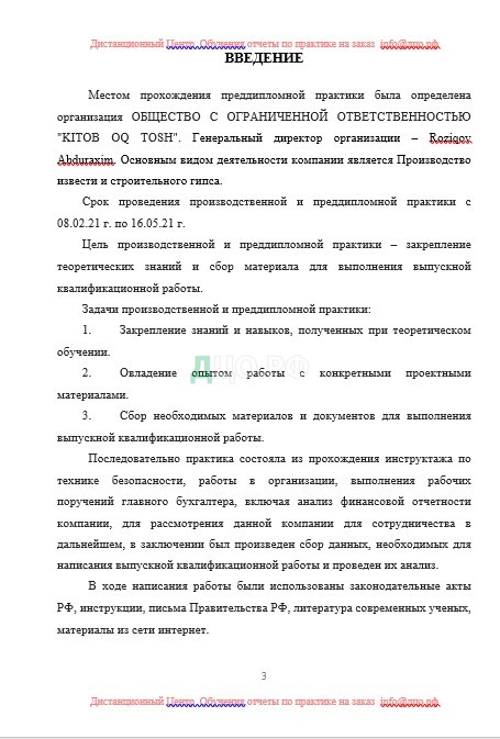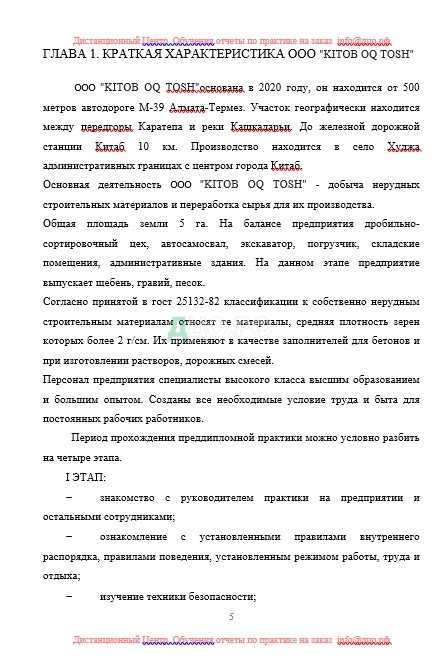 Местом прохождения преддипломной практики была определена организация ОБЩЕСТВО С ОГРАНИЧЕННОЙ ОТВЕТСТВЕННОСТЬЮ «KITOB OQ TOSH». Генеральный директор организации – Roziqov Abduraxim. Основным видом деятельности компании является Производство извести и строительного гипса.
