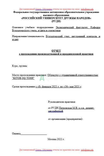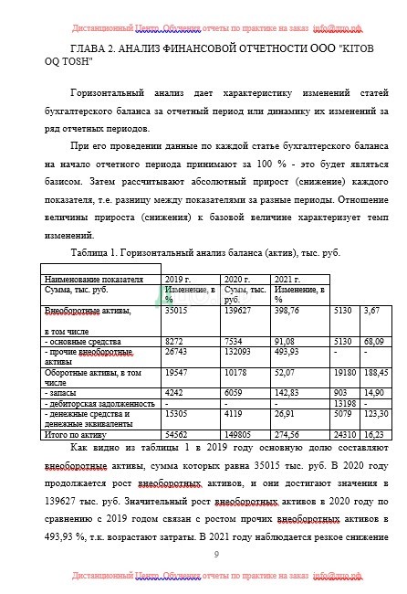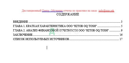 Структурно работа состоит из введения, двух глав и заключения. Во введении указано место и временные рамки прохождения производственной практики, определены цель и задачи. В первой главе представлена краткая характеристика ООО «KITOB OQ TOSH»- организации, выступающей местом прохождения преддипломной практики, во второй главе представлен анализ финансовой отчетности ООО «KITOB OQ TOSH» выступающей объектом исследования в выпускной квалификационной работе, в заключении подведены итоги прохождения практики.