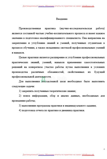 Производственная практика (научно-исследовательская работа) является составной частью учебно-воспитательного процесса и имеет важное значение в подготовке квалифицированного специалиста. Она направлена на закрепление и углубление знаний и умений, полученных студентами в процессе обучения, а также овладением системой профессиональных умений и навыков.