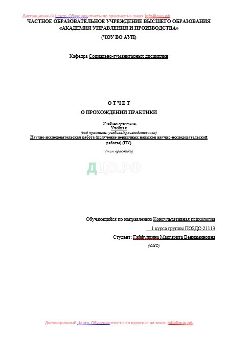 Титульный лист отчета по практике по психоанализу и консультативной психологии