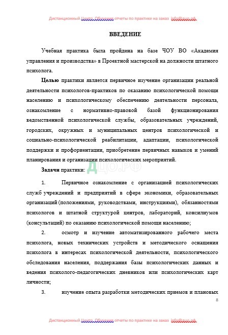 8. составление отчета о практике с формулировкой предложений по возможным направлениям более полного использования потенциала организации и повышения психолого-педагогической компетентности персонала.