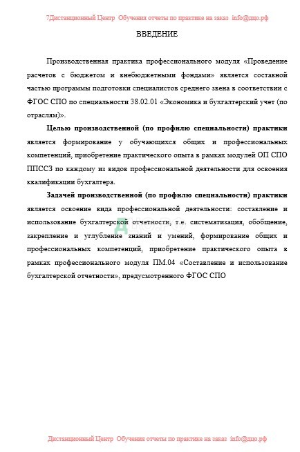 Производственная практика профессионального модуля «Проведение расчетов с бюджетом и внебюджетными фондами» является составной частью программы подготовки специалистов среднего звена в соответствии с ФГОС СПО по специальности 38.02.01 «Экономика и бухгалтерский учет (по отраслям)».