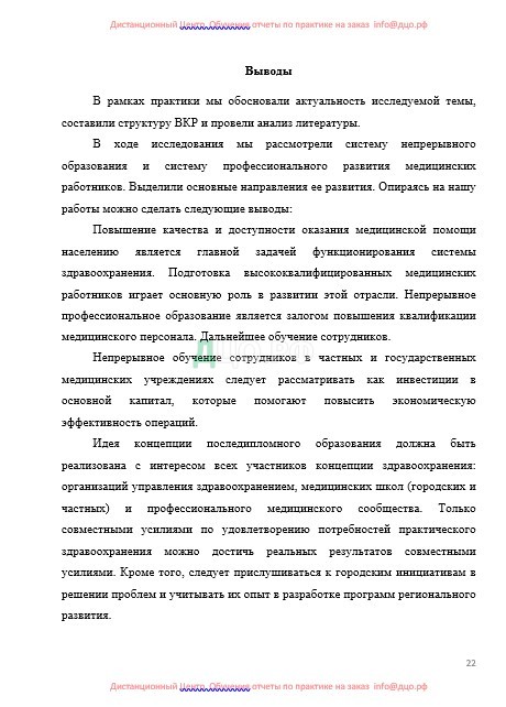 Анализ содержания ряда работ (В.А.Лапотников, Ваганов Н.Н., Перфильева Г.М. и др) показывает, что последипломное образование медицинских работников остается актуальным на протяжении многих лет. От квалификации медицинских работников, от уровня их подготовки зависит решение множества задач перед системой здравоохранения.