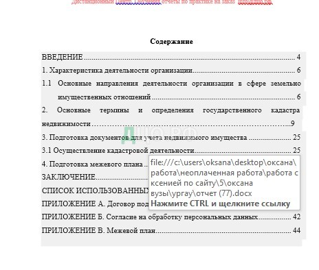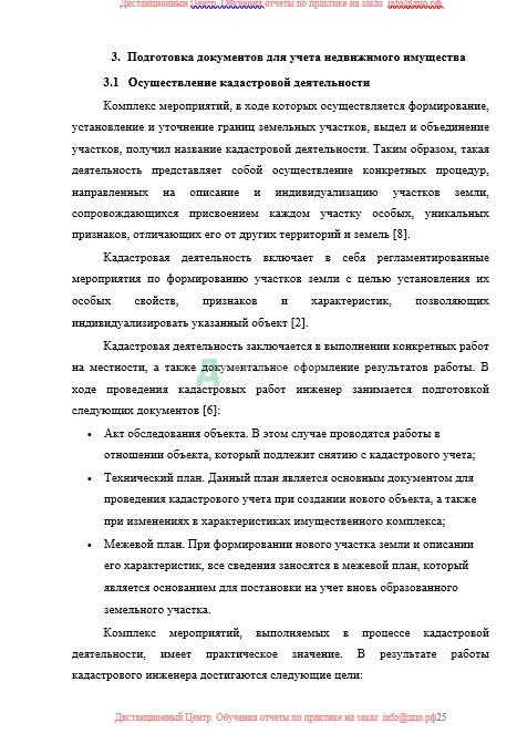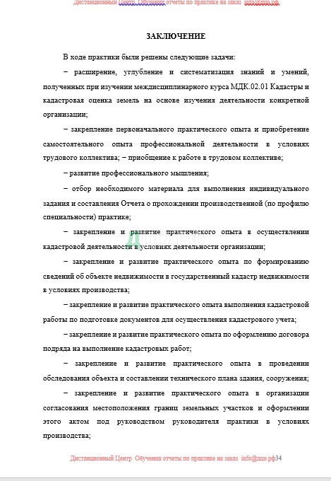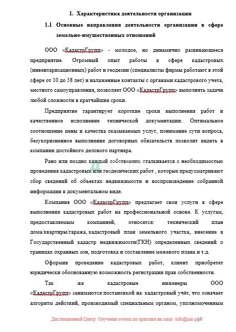 В ходе прохождения практики была изученая деятельность организации, основные направления деятельности организации в сфере земельно-имущественных отношений, подготока документов для учета недвижимого имущества, осуществление кадастровой деятельности и подготовка межевого плана.