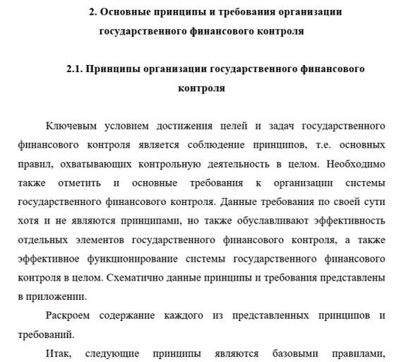 Любые государственные программы реформирования и развития областей экономики для их успешной реализации должны предусматривать эффективную систему государственный финансовый контроль. От того, насколько качественной будет информация, предоставляемая системой государственного финансового контроля, во многом зависит обоснованность решений, затрагивающих различные сферы как государственной финансово-экономической политики, так и финансово-хозяйственной деятельности государственных организаций, организаций с государственным