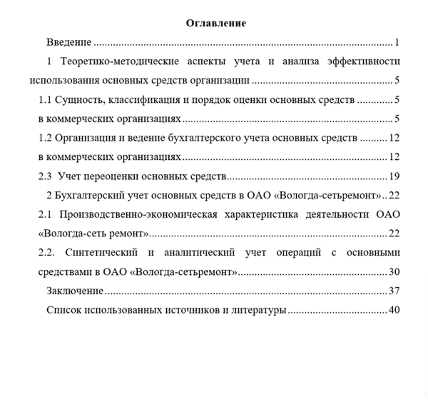Выпускная квалификационная работа состоит из введения, трех глав, заключения и списка использованных источников и литературы. Во введении определена актуальность работы, сформированы цели и задачи исследования. В первой главе рассмотрены теоретические основы учета и анализа основных средств предприятия. Вторая глава содержит оценку бухгалтерского учета основных средств ОАО «Вологда-сетьремонт». Третья глава включает результаты анализа использования основных средств ОАО «Вологда-сетьремонт». В заключении сформированы выводы по результатам исследования. Список использованных источников содержит 41 наименование.
