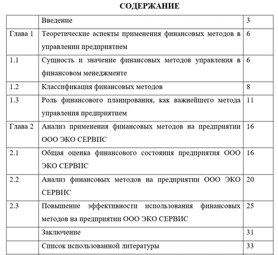 Цели и задачи курсовой работы обусловили следующую её структуру. Работа состоит из содержания, введения, двух глав («Теоретические аспекты применения финансовых методов в управлении предприятием», «Анализ применения финансовых методов на предприятии ООО ЭКО СЕРВИС»), заключения, списка использованной литературы и приложений.