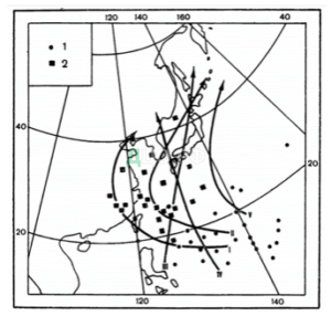 Затем они совершают поворот, достигая точки у тропика Рака (23 град. 26 мин к северо-востоку от экватора), и далее двигаются на север, северо-восток. 1058 тропических циклонов, которые образовались в северо-западной части Тихого океана за период с 1970 по 2011 годы, были проанализированы Г. Г. Таракановым и им определена численность таких циклонов, выходящих на Дальневосточные регионы России. Данными исследованиями было установлено, что в тропических циклонах с Дальнего Востока России можно выделить 4 основных типа траекторий (рисунок 8).
