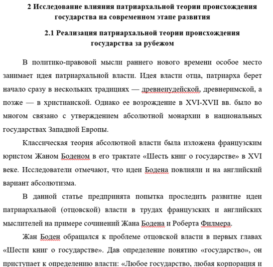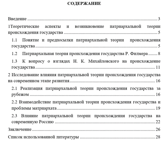 Структура работы представлена введением, двумя главами, заключением и списком литературы. Первая глава посвящена исследованию теоретических аспектов и возникновение патриархальной теории происхождения государства. Вторая глава направлена на исследование влияния патриархальной теории происхождения государства на современном этапе развития.