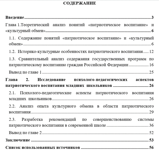 Структура работы представлена введением, двумя главами, заключением и списком использованных источников. Первая глава посвящена анализу понятий «патриотическое воспитание» и «культурный обмен». Вторая глава содержит исследование психолого-педагогических аспектов патриотического воспитания младших школьников.