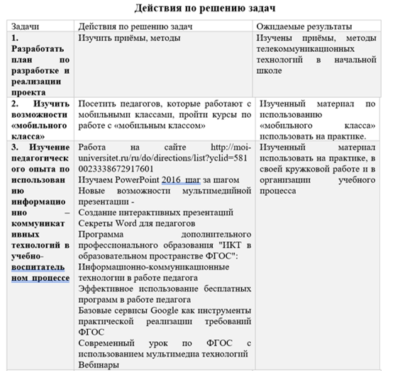 Роль учителя на уроке с использованием компьютерных телекоммуникаций изменяется, учитель теперь не только источник знаний, но и менеджер процесса обучения, главными задачами педагога становятся: управление познавательной деятельностью учащегося. «Мобильный класс» позволяет реализовать данную задачу. Для этого были продуманы задачи и действия по реализации проекта.