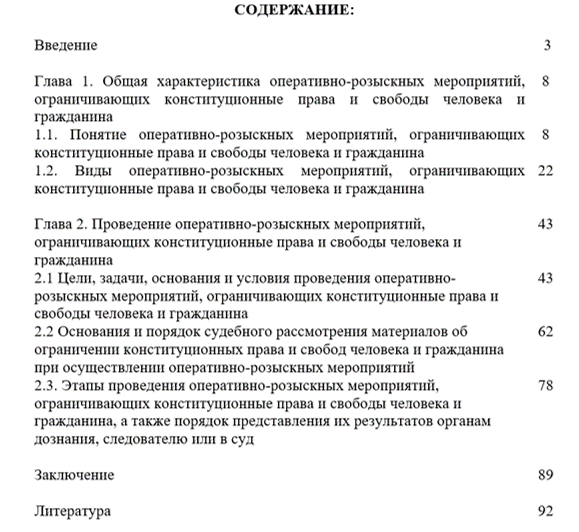 Структура работы представлена двумя главами. Первая глава представлена характеристикой оперативно-розыскных мероприятий, ограничивающих конституционные права и свободы человека и гражданина, а именно понятия оперативно-розыскного мероприятия и его виды. Вторая глава посвящена исследованию проведения оперативно-розыскных мероприятий, ограничивающих конституционные права и свободы человека и гражданина. Данный раздел содержит анализ оснований и порядка судебного рассмотрения материалов об ограничении конституционных права и свобод человека и гражданина при осуществлении оперативно-розыскных мероприятий.