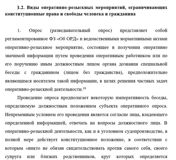 Законный характер возможных ограничений конституционных прав граждан при осуществлении ОРД подтвержден позицией Конституционного Суда РФ. В частности, в Определении Конституционного Суда РФ «По жалобе граждан М.Б. Никольской и М.И. Сапронова на нарушение их конституционных прав отдельными положениями Федерального закона «Об оперативно-розыскной деятельности» от 04.02.1999» утверждается, что оперативно-розыскные мероприятия направлены на борьбу с преступностью, осуществляются именно в целях защиты личности, общества и государства от преступных посягательств и, следовательно, «не могут рассматриваться как нарушение Конституции Российской Федерации», а в Определении Конституционного Суда РФ «По делу о проверке конституционности отдельных положений Федерального закона «Об оперативно-розыскной деятельности» по жалобе гражданки И.Г. Черновой» от 14.07.1998 прямо сказано: «Осуществление негласных оперативно-розыскных мероприятий с соблюдением требований конспирации и засекречивание сведений в области оперативно-розыскной деятельности само по себе не нарушает прав человека и гражданина».[4] Конституционный Суд РФ подчеркивает, что преступное деяние не является сферой частной жизни лица, сведения о которой не допускается собирать, хранить, использовать и распространять без его согласия, а потому проведение оперативно-розыскных мероприятий не может рассматриваться как нарушение конституционных прав, предусмотренных ст. 24 Конституции РФ. Нормы Конституции РФ (ст. 2 и ст. 45) возлагают обязанности по охране и защите прав и свобод человека и гражданина, которые нарушаются в результате преступной деятельности, на органы государственной власти и декларируют, что права потерпевших от преступлений охраняются законом (ст. 52).[5] В этих условиях ОРД, с одной стороны, служит средством охраны и защиты прав граждан, в том числе и потерпевших от преступлений, а, с другой стороны, для обеспечения конституционных прав законопослушных граждан в процессе проведения ОРМ вынужденно ограничиваются некоторые конституционные права других граждан.