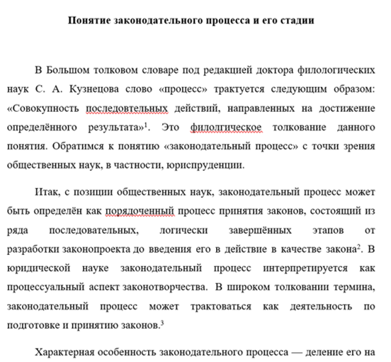 В Большом толковом словаре под редакцией доктора филологических наук С. А. Кузнецова слово «процесс» трактуется следующим образом: «Совокупность последовтельных действий, направленных на достижение определённого результата»[1]. Это филолгическое толкование данного понятия. Обратимся к понятию «законодательный процесс» с точки зрения общественных наук, в частности, юриспруденции.