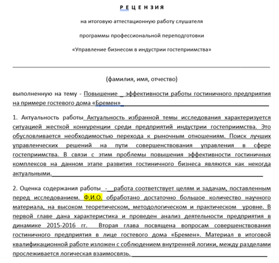 Автором предложен комплекс мероприятий, направленные на повышение эффективности работы гостевого дома «Бремен». Заслуживает внимания умение автора самостоятельно работать с теоретическим и практическим материалом, аккуратность и точность в исполнении поставленных задач и настойчивость в достижении поставленной цели.