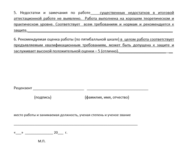 В целом работа соответствует предъявляемым квалификационным требованиям, может быть допущена к защите и заслуживает высокой положительной оценки – 5 (отлично).
