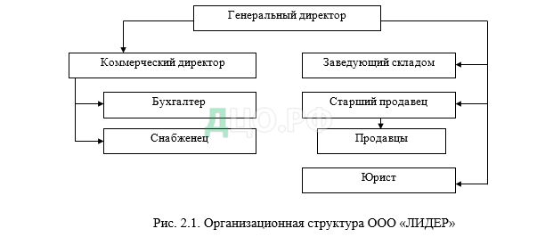 Штат работников ООО «ЛИДЕР» включает: генерального директора, коммерческого директора, бухгалтера, снабженца, юриста, старшего продавца, продавцов, заведующего складом, заведующего складом. Организационная структура ООО «ЛИДЕР» соответствует размеру организации, относится к линейной структуре управления, что позволяет создавать необходимые условия для выполнения функций на всех уровнях управления.