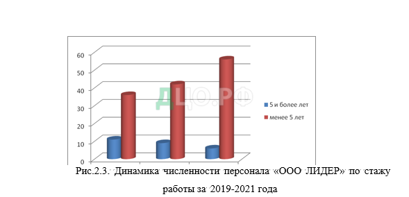 Динамика численности персонала ООО «ЛИДЕР» по стажу работы за 2019-2021 года показана на рисунке 2.3.