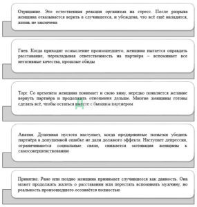 - стадия депрессии. Наступает подавленное настроение, когда отрицание, агрессивность и переговоры не приносят желаемых результатов. Длительное состояние депрессии мешают заводить женщине новые интимные отношения. Женщина чувствует себя неудачником, снижается уровень самооценки, женщина начинает сторониться других людей, не доверять им;