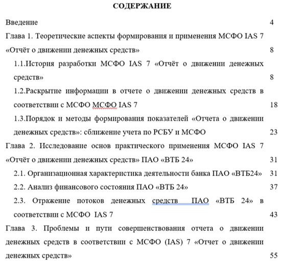 Структура работы представлена тремя главами. Первая глава посвящена изучение теоретических и методологических аспектов формирования и применения МСФО IAS 7 «Отчёт о движении денежных средств». Вторая глава содержит исследование основ практического применения МСФО IAS 7 «Отчёт о движении денежных средств» на примере ПАО «ВТБ 24», а так же финансовый анализ объекта исследования. В третьей главе определены проблемы и предложены тупи совершенствования отчета о движении денежных средств в соответствии с МСФО (IAS) 7 «Отчет о движении денежных средств».