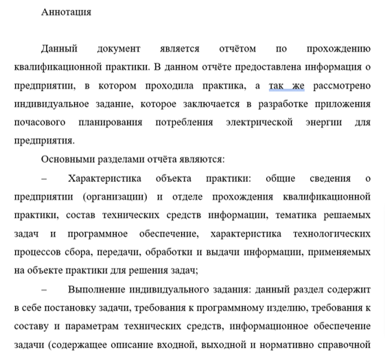 Суть практики заключается в разработке программного средства для автоматизации почасового планирования потребления электрической энергии предприятия ЗАО “Красноярский ДОК” г.Красноярска, Красноярского края, на месте прохождения стажировки.