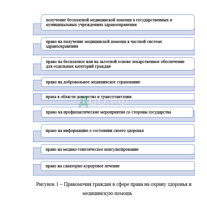Важно отметить, что права пациентов в области охраны здоровья реализуются через обеспечение бесплатной медицинской помощи в государственных и муниципальных учреждениях здравоохранения. Это означает, что граждане имеют право на бесплатное лечение и медицинскую помощь при заболеваниях или травмах. Права пациентов в области охраны здоровья являются важным аспектом гражданских прав и обеспечивают доступность и качество медицинской помощи для всех граждан. На рисунке 1 приведены основные правомочия граждан в сфере охраны здоровья и права на медицинскую помощь.