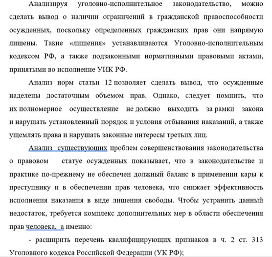 Анализ существующих проблем совершенствования законодательства о правовом статуе осужденных показывает, что в законодательстве и практике по-прежнему не обеспечен должный баланс в применении кары к преступнику и в обеспечении прав человека, что снижает эффективность исполнения наказания в виде лишения свободы. Чтобы устранить данный недостаток, требуется комплекс дополнительных мер в области обеспечения прав человека, а именно: