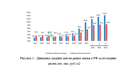 Во-первых, спрос на вторичное жилье сильно просел из-за отсутствия в этот период государственных льготных программ по ипотеке, без которых в текущих условиях было невыгодно покупать вторичное жильё. Помимо этого, общий объем предложения на рынке снизился из-за неопределённых экономических условий: люди решили переждать кризис с квартирой, а не с рублями. Всё это привело к снижению рыночных цен на вторичное жилье. Цены 1 м2 в августе 2022 года по сравнению с июлем этого же года снизились на двухкомнатные (–2,6 %) и трёхкомнатные (–1,8 %) квартиры.