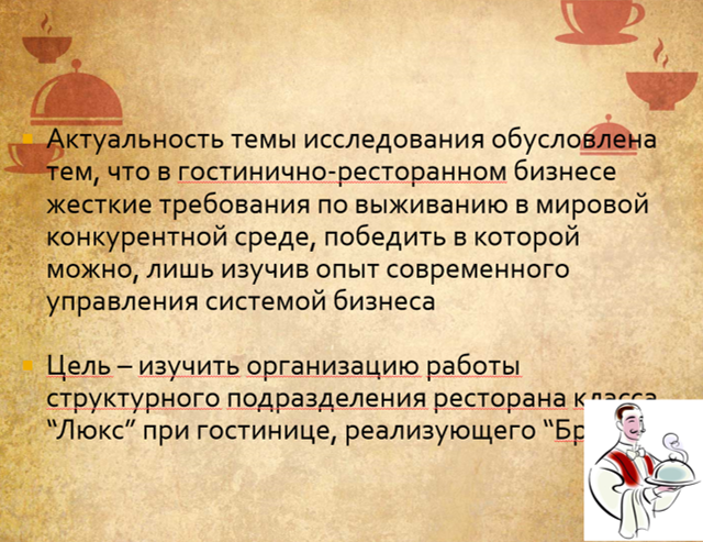 Актуальность темы исследования обусловлена тем, что в гостинично-ресторанном бизнесе жесткие требования по выживанию в мировой конкурентной среде, победить в которой можно, лишь изучив опыт современного управления системой бизнеса.