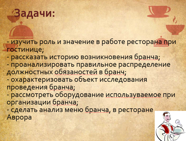Цель – изучить организацию работы структурного подразделения ресторана класса “Люкс” при гостинице, реализующего “Бранч”.