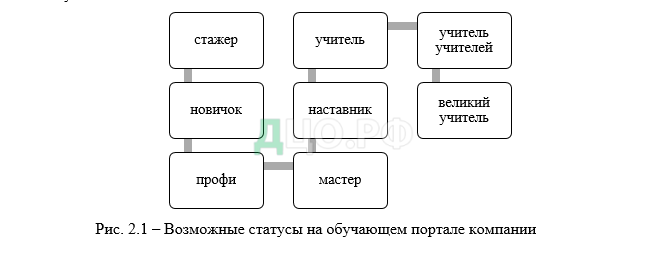 Стандартными статусами в системе дистанционного обучения могут быть, следующие: стажер, новичок, профи, мастер, наставник, учитель, учитель учителей, великий учитель.