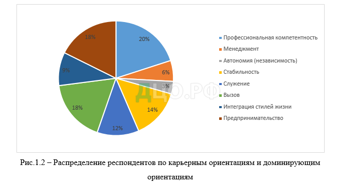 На диаграмме ниже (рис.1.2), представлена обработка тестов и распределение персонала ЗАО «Спецсудопроект» по карьерным ориентациям и доминирующим ориентациям.