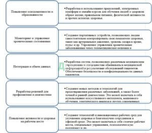 — Система управления здоровьем: внедрение электронных систем управления здоровьем учащихся, которые позволяют отслеживать и анализировать данные о физическом состоянии, привычках и образе жизни учеников, предоставлять рекомендации по улучшению здоровья и следить за соблюдением медицинских рекомендаций.