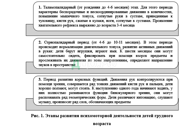 В развитии детей грудного возраста выделяется 3 главных этапа развития психомоторной деятельности детей, представленные на рисунке 1 [2].