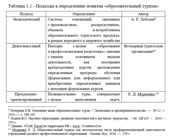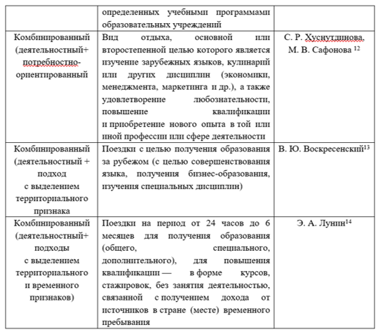 Рассмотрим различные подходы к формулировке данного определения. Один из подходов к определению образовательного туризма состоит в значении его как продолжения отечественного образования. То есть образовательный туризм является одной из составляющих форм отечественного образования. Так, в своей работе «Специальные виды туризма» 2015 г. А. В. Бабкин считает, что образовательный туризм – это «явление сравнительно новое, еще пять лет назад такой вид отдыха рассматривали немногие. Однако в свете современной динамики развития общемировой экономики, международных отношений популярность «полезного отдыха» существенно возросла»[2].