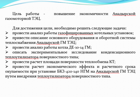 Цель работы: повышение экономичности Анадырской газомоторной ТЭЦ.