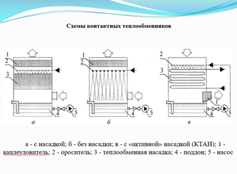 По конструктивным особенностям контактные теплоутилизаторы можно разделить на три основные группы: насадочные, полые и типа КТАН (контактный теплообменник с активной насадкой). Принципиальные схемы этих теплообменников представлены на слайде.