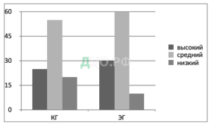 Рис. 5. Уровень психического состояния детей контрольной (КГ) и экспериментальной (ЭГ) групп по методике «Паровозик» на констатирующем этапе эксперимента (%)