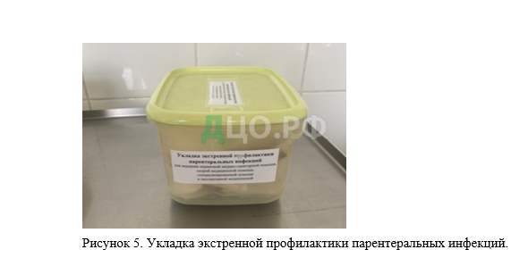В процедурном кабинете имеется укладка для помощи при состояниях угрожающих жизни и для экстренной профилактики ВИЧ-инфекции (Рисунок 5), в которых старшая медсестра регулярно контролирует укомплектованность и сроки годности лекарственных препаратов. Состав новой укладке для оказания первичной медико-санитарной помощи при возникновении аварийной ситуации укомплектован согласно Приказу МЗ РФ от 9 января 2018 г. N 1н. При возникновении аварийной ситуации медперсонал заполняет Журнал аварийной ситуации, сообщает дежурному врачу отделения, проводит первичные мероприятия.