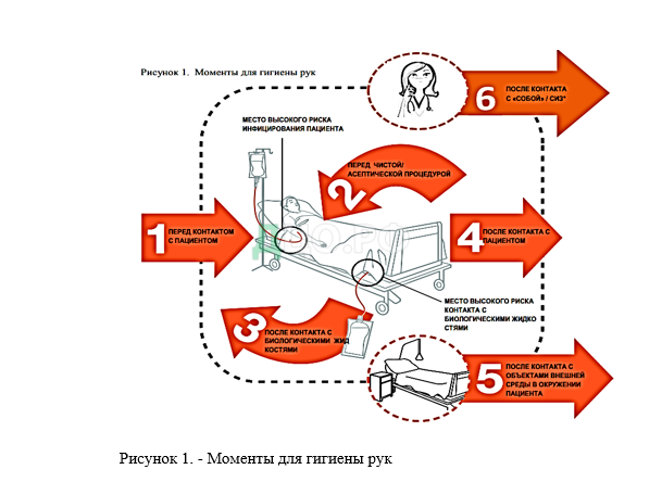 Исходя из этого общие требования к гигиене рук медицинского персонала сводятся к следующим (1) до контакта с пациентом, (2) до чистых/асептических процедур, (3) после ситуации, связанной с риском контакта/контактом с биологическими жидкостями, (4) после контакта с пациентом, (5) после контакта с предметами из окружения пациента, (6) после контакта «с собой»/средствами индивидуальной защиты.