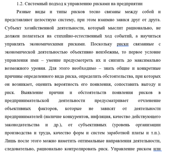 Таким образом, актуальность исследования в сфере управления рисками на предприятии обусловлена необходимостью разработки комплексного, всестороннего подхода к риск-менеджменту, который координируется в рамках всей организации. Способность эффективно влиять на риски дает возможность успешно функционировать предприятию, иметь финансовую устойчивость, высокую конкурентоспособность и стабильную прибыльность.