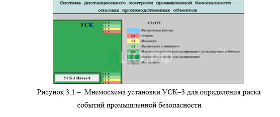 При возникновении события статус оборудования и блока будет изменен и блок оборудования будет окрашен в цвет, соответствующий легенде. Общий пример визуального отображения на мнемосхеме статусов состояния технических устройств промышленной безопасности на УСК–3 представлен на рисунке 3.2.