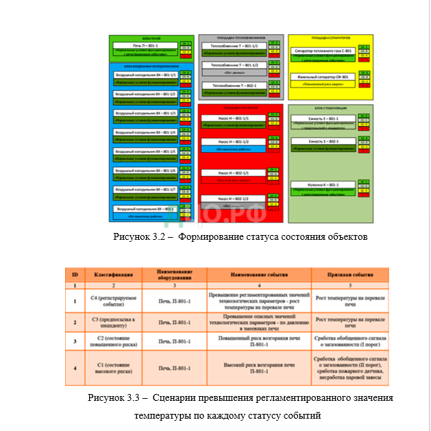 В окне параметров отображаются подробная информация о текущем статусе, времени возникновения событий, их продолжительности и значения параметров, влияющих на статус оборудования. На рисунке 3.3 продемонстрирован сценарий превышения регламентированного значения температуры на примере печей по каждому статусу события. При необходимости система позволяет сформировать отчет по состоянию промышленной безопасности производственного объекта за указанный период.